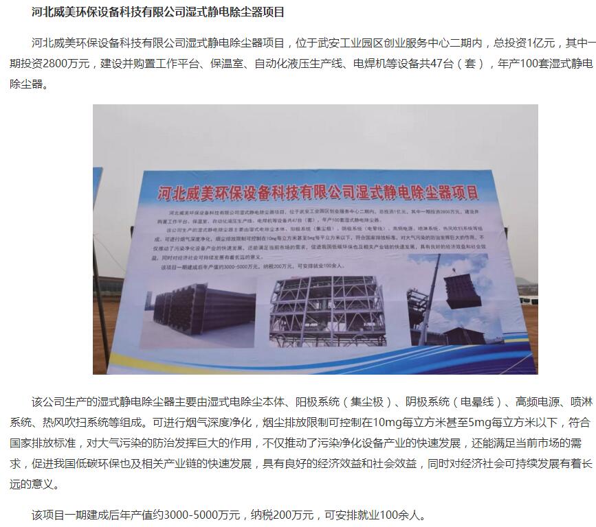 河北威美環(huán)保設(shè)備科技有限公司濕式靜電除塵器項(xiàng)目,位于武安工業(yè)園區(qū)創(chuàng)業(yè)服務(wù)中心二期內(nèi),建設(shè)并購(gòu)置工作平臺(tái)、保溫室、自動(dòng)化液壓生產(chǎn)線等設(shè)備共47臺(tái)(套),年產(chǎn)100套濕式靜電除塵器。