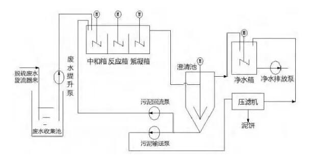 (2)將脫硫廢水加藥系統(tǒng)接一路至事故漿液箱,廢水在事故漿液箱內(nèi)進(jìn)行中和、凝聚、絮凝。