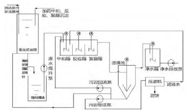 (4)壓濾機(jī)的濾液水接至三聯(lián)箱,經(jīng)澄清池再次沉淀*終排出。