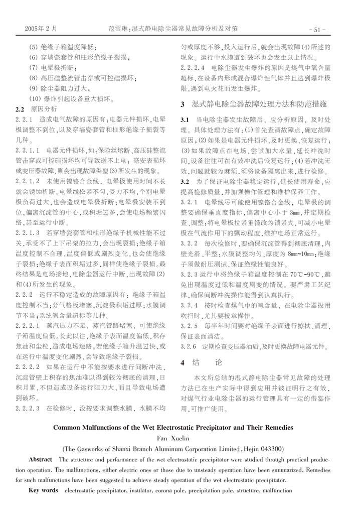 本論文研究了濕式靜電除塵器的結構和性能,根據生產實踐歸納了濕式靜電除塵器在運行中經常出現的故障,包括電氣故障和運行不穩定造成的故障,并對故障原因進行了分析,提出了處理方法和預防措施,以便達到提高濕式靜電除塵器運行穩定性的目的。