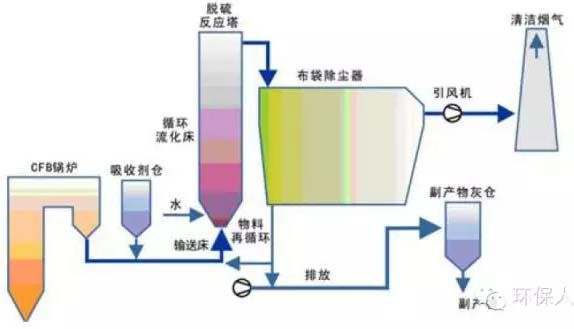 以循環(huán)流化床原理為基礎(chǔ),通過物料的循環(huán)利用,在反應(yīng)塔內(nèi)吸收劑、吸附劑、循環(huán)灰形成濃相的床態(tài),并向反應(yīng)塔中噴入水,煙氣中多種污染物在反應(yīng)塔內(nèi)發(fā)生化學(xué)反應(yīng)或物理吸附;經(jīng)反應(yīng)塔凈化后的煙氣進入下游的除塵器,進一步凈化煙氣。此時煙氣中的SO2和幾乎全部的SO3,HCl,HF等酸性成分被吸收而除去,生成CaSO3•1/2H2O、CaSO4•1/2H2O等副產(chǎn)物。